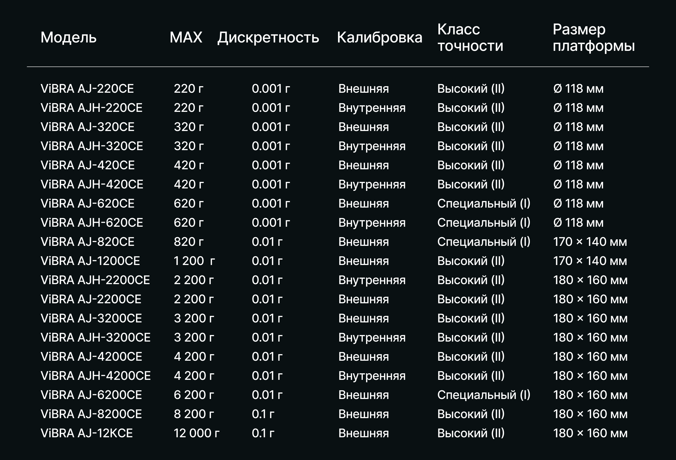Весы ViBRA AJ — надёжное решение для ежедневного взвешивания в лабораториях, медицине, пищевом и ювелирном производстве. Серия включает модели с платформами трёх типов и максимальной нагрузкой до 620 г, все они оснащены датчиком Tuning Fork для быстрой стабилизации и высокой точности измерений. Приборы комплектуются лёгкосъёмной ветрозащитой (в моделях до 620 г), работают от сети или встроенного аккумулятора, не требуют прогрева и моментально готовы к работе. Встроенная калибровка и защитный кожух корпуса входят в стандартную комплектацию.